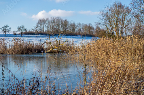 lake, winter, riparian, waterside, duck pond, water, snow, frost, cold, sunny, wetland, reed, nature, natural, landscape, shallow, tree, bush, river, rivulet, idylli, peaceful, habitat