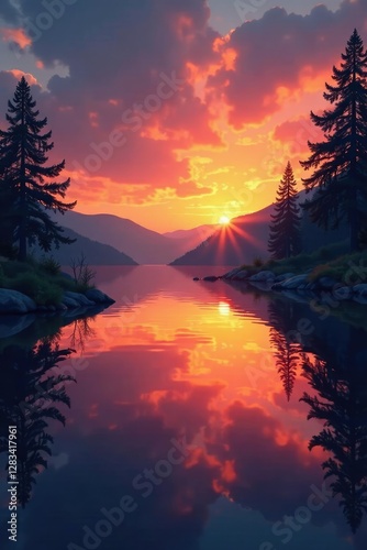 lake scene at sunset with a serene and peaceful atmosphere, reflective, water