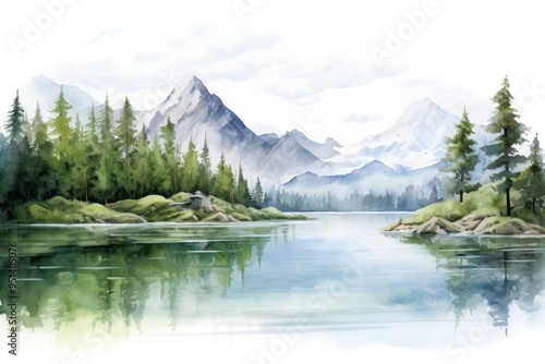 lake, landscape, plant, tree, watercolor, nature, paper, person, illustration, mountain, outdoors, scenery, forest, cloud, water, land, sky, wilderness, pine tree, painting, drawing, vignetting, travel, winter, snow, human, fog, isolate, mountain chain, mountain peak, vegetation, panoramic, activity, day, idylli, calmness, body of water, tranquil scene, conifer