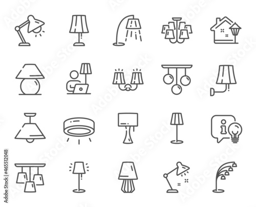 Lamps line icons. Spotlight led, Table Lamp and Floor Light. Modern chandelier, Electric light illuminate and Wall lamp icons. Lightbulb info, stand lamp and street light. Wall sconce. Vector