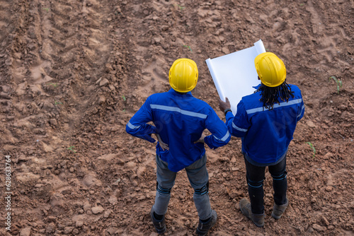 Land surveyor team standing working together at construction field consult study looking building location with floor plan