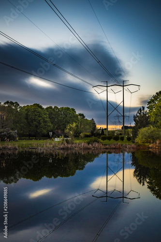 water, sky, lake, landscape, river, nature, electricity, power, blue, sunset, pylon, energy, tree, electric, line, electrical, duck pond, tree, cloud, voltage, summer, tower, outdoors, green