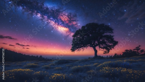 landscape featuring the Milky Way, stars, and a silhouette of a tree against the night sky