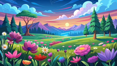 landscape, sky, nature, grass, vector, summer, spring, field, sun, cartoon, cloud, tree, illustration, meadow, flower, hill, rainbow, mountain, cloud, countryside, season, flower, scene, view, road