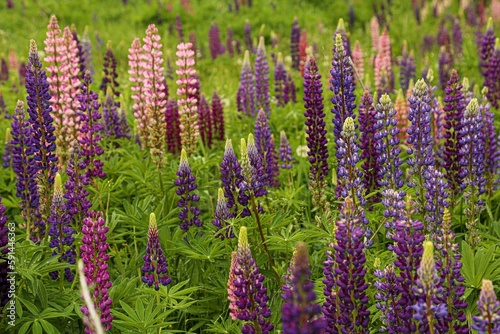 Landscape of a field covered in lupines and greenery on a sunny day