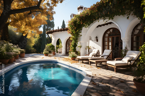 Landscape of Villa, hotel house modern with swimming pool in view nature green tree. Typical white architecture background. Luxury travel summer vacation destination. Interior is modern and beautiful.