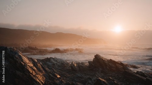 landscape, photograph, rocky, coastline, sunset, sky, beautiful, orange, pink, colours, sun, visible, corner, rising, horizon, warm, glow, water, rock, deep, blue, wave, crashing, shore, hill, greenery, boulder, scattered, shoreline, mood, peaceful, serene, photo, nature, lifestyle, outdoors, remote