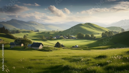 landscape with mountains and sky, the view of the houses standing in the beautiful meadow