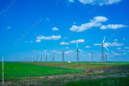 Landscape with wind farms on the background of a green field.