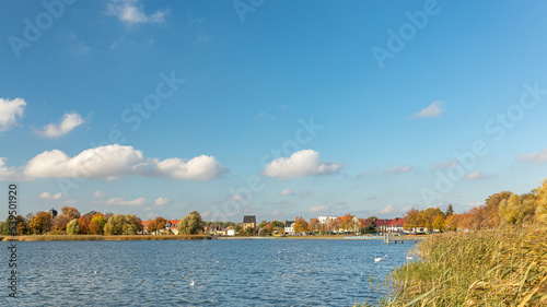 Landschaft mit Siedlung Stadt Ort Häusern sowie Schilf und Bäumen am Ufer von einem See