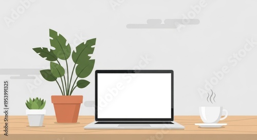 laptop, desk, computer, screen, plant, pot, hot drink, cup, workspace, office, work, technology, modern, design, illustration, vector, white, green, brown, table, background, minimalist, clean, style, digital, isolated, copy space, empty, business, presentation, website, creative, flat, graphic, desktop, indoor, leaf, art, environment, graphic design, view, communication, working