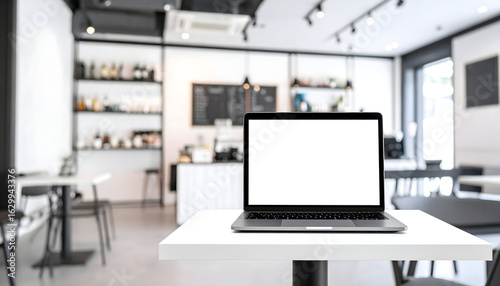laptop, computer, technology, portable, device, screen, display, blank, white, table, cafes, interior, work, business, workspace, modern, design, minimalist, clean, bright, indoor, digital, online, communication, desktop, job, cyberspace, monitor, open, copy space, electronic, isolated