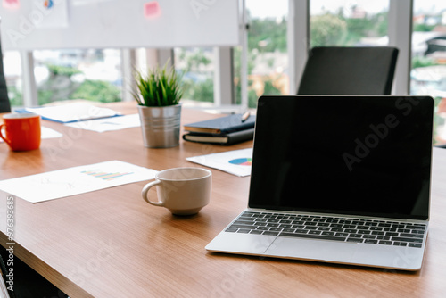 Laptop computer with opened lid on table in meeting room of office workspace. uds