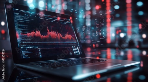 Laptop Computer with Sound Waves and Data Visualizations. AI generated illustration