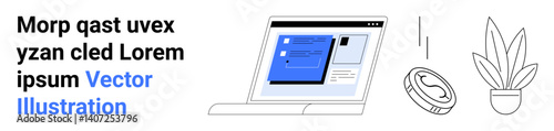 laptop, app, interface, coin, dollar, plant, potted, business, technology, finance, investment, growth, productivity, remote, digital, workspace, innovation, economy, metaphor, flat, concept, text, banner, website, web, card, landing, page, blue, black, abstract, minimalism, simplicity, profit, money, vector, illustration, icon