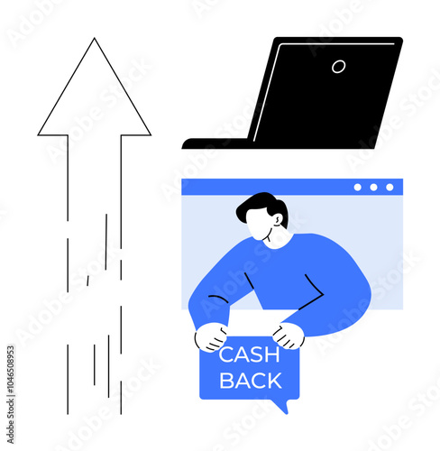 Laptop, man holding cashback sign in browser window, and upward arrow. Ideal for e-commerce, promotions, finance, online shopping, customer rewards. Vector art, two-tone style, minimal design