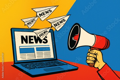 news, laptop, pop art, media, technology, megaphone, surreal, cyberspace, press, message, broadcast, paper plane, newsletter, high contrast, yellow background, editorial, publishing, storytelling, iconography, communication, business, illustration