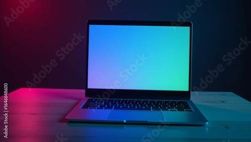 Laptop with blue green screen on wooden desk with pink and blue lighting
