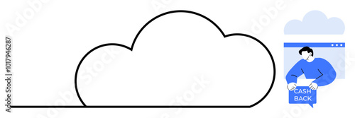 Large cloud icon and a person in a browser window holding a cashback sign. Ideal for online shopping, cashback programs, cloud services, tech ads, and financial incentives. Minimalist vector style