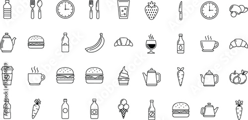 food, beverage, eatery, icon, vector, nourishment, healthy, bakery, breakfast, dinner, vegetable, kitchen, snack, drink, bistro, coffee cup, water bottle, ice cream, kitchen utensile, healthy eating, teapot