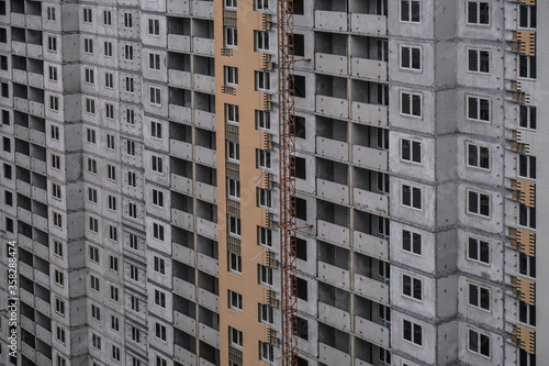 Large construction site on a background of blue sky. Brick, panel apartment building. Industrial theme for design