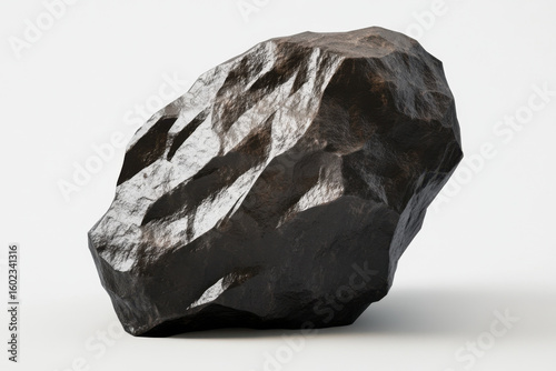 Large, dark, irregular rock with a rough surface rests prominently on a bright white background, casting a subtle shadow.