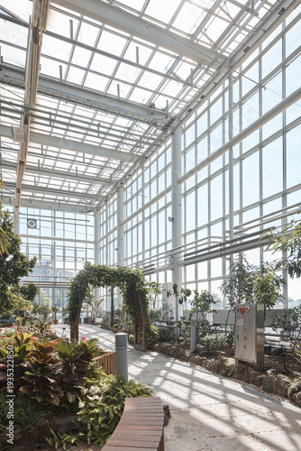 Large glass atrium greenhouse with plants in modern conservatory interior
