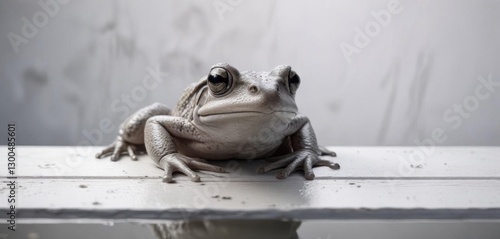 Large grey frog sitting on a smooth white wooden panel partially submerged in murky water , animal, pond