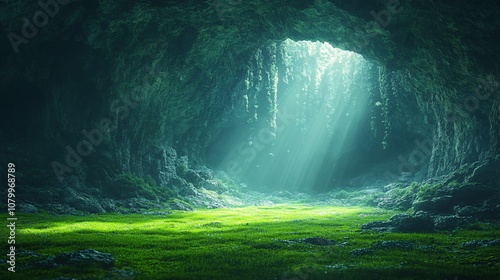 Large grotto in the mountain, grass, daylight in the cave, light green shades,