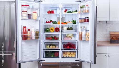 refrigerator, refrigerator, open, door, background, product, kitchen, food, fresh, house, home, wall, white, fruit, vegetable, colours, healthy, modern, silver, drink, steel, frost, sausage, brick, storage, domestic, temperature, appliance, stainless, equipment, electric, freeze, refrigeration, shelf, large, assortment, cold, cool, different, filled, full, grocery, household, indoor, keep, many, nobody, object, preserve