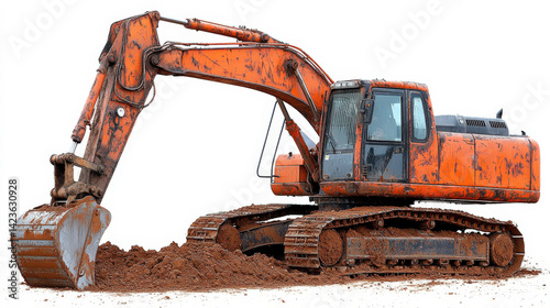 shoveling, orange, construction, vehicle, machinery, bucket, digging, dirtied, mud, heavy equipment, industrial, construction site, crawler, equipment, work, progress, isolated, white background, powerful, industry, development, infrastructure, ground, dirt