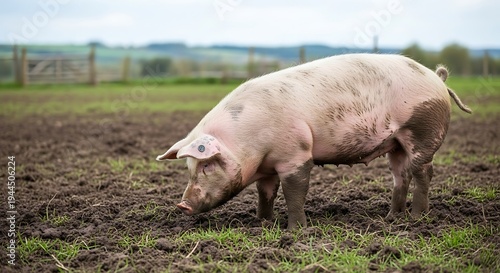 Large Pink Pig Sniffing Muddy Ground in Farm Field