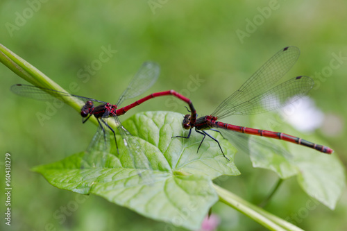 Large Red Damselfly, Pyrrhosoma nymphula, male and female copulate on green leaf