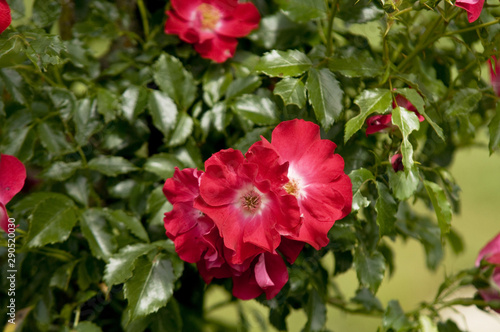 Large single crimson red Climbing Rose ' Dortmund' (Kordes, 1955), closeup, , selective focus..Concept: rose passion, garden hobby, gardening, garden blog, botanica, roses lovers.
