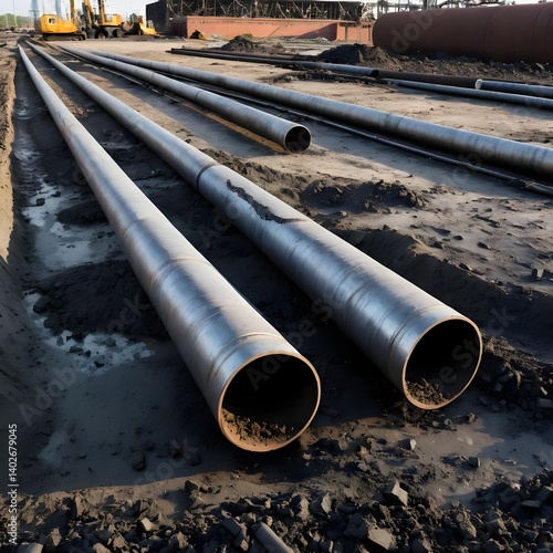 construction site, pipeline, construction, industry, infrastructure, engineering, metal, pipe, construction work, building, outdoors, daytime, industrial, large, heavy, long, ground, earth, dirtied, dirt, transportation, energy, resource, factory