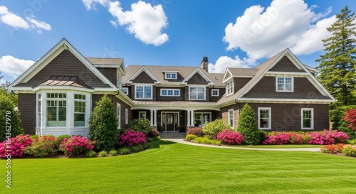 house, home, real estate, suburban, architecture, residential, property, exterior, building, lawn, grass, green, manicured, landscaping, garden, flower, pink, azalea, tree, shrub, window, roof, chimney, driveway, cloud