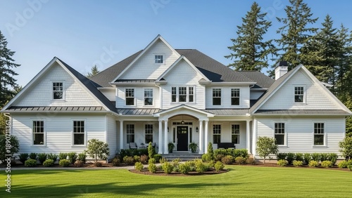 house, white house, lawn, tree, tall trees, residential, architecture, real estate, home, dwelling, property, estate, suburban, neighbourhood, residential area, landscape, yard, front yard, gardening, beautiful, luxury, expensive, big, roomy, elegant, sophisticated, trimmed, neat, clean, white, black, grey, green, blue, building, structure, design, style, traditional, classic