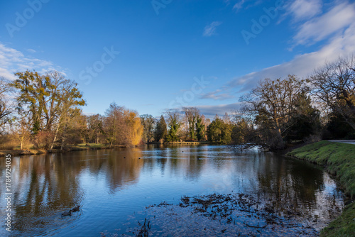 Late Autumn/Early Winter Scene by a Pond in a Historic Park: Reflections of Bare Trees and Willows in the Water on a Clear Day
