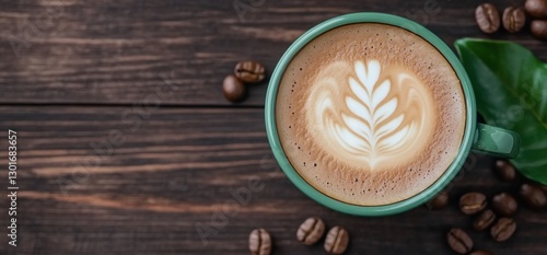 latte, hot drink, coffee bean, drink, art, cafes, cup, hot, morning, breakfast, beverage, wooden, table, top, view, dark, brown, green, design, pattern, foam, delicious, aroma, warm, relaxing, cafes, relaxation, cappuccino, espresso