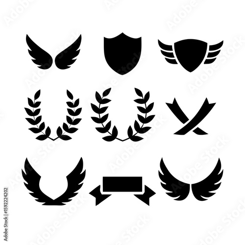 Laurel wreath, shield, wing, ribbon, and banners vector set. Laurel wreaths, shields, wings, ribbons illustration for awards, heraldry, logos, badges, and branding designs .