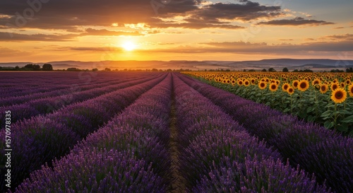sonnenblumenfeld, sunset, sunrise, golden hour, summer, landscape, nature, flower, plant, agriculture, countryside, rural, scenic, beautiful, photo, image, background, wallpaper, travel, vacation, serenity, peace, calm, calmness, vibrant, colourful, purple, yellow, idylli, picturesque, farm, field, blooming, blossom, flora, botany, environment, natural beauty, sunlight, ray, cloud, sky, horizon, beauty, amazing, stunning, breathtaking