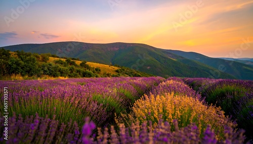 lavandula, field, sunset, mountain, hill, vibrant, colours, nature, landscape, gold, purple, pink, flower, blooming, summer, spring, scenic, beautiful, peaceful, tranquil, horizon, sky, green, yellow, foliage, meadow, rural, outdoors, photo, view