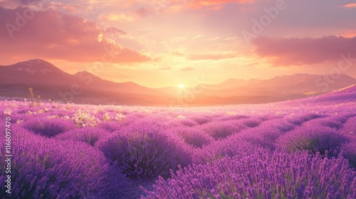 Lavender Field Sunset Over Majestic Mountains