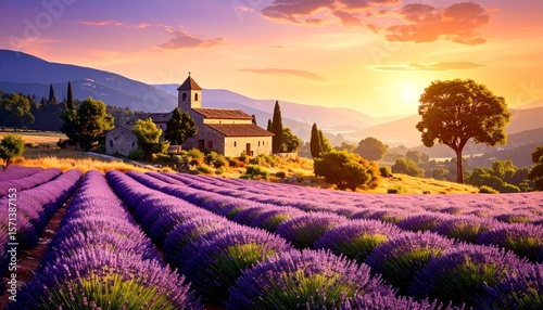 Lavender Fields in Provence at Golden Hour, Dreamy Purple Landscape / プロヴァンスのラベンダー畑、ゴールデンアワーの幻想的な紫の風景