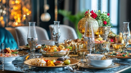 food, table, dinner, dish, plate, decor, gold, silver, luxury, elegant, arabian, feast, delicious, rich, culinary, epicure, cookery, appetiser, main course, dessert, glassware, cutlery, setting, opulence, royalty, ambience, home, interior, design, lifestyle, still life, photo, gastronomy, meal, party, celebration, special, occasion, gathering, eatery