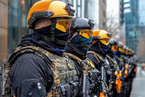 law enforcement, officer, urban setting, helmet, prepared, security, modern building, city, teamwork, safety, coordination, vigilance, organised, professional, standing, assembled, operation, modern architecture, public safety, readiness, city skyline, engagement, observation