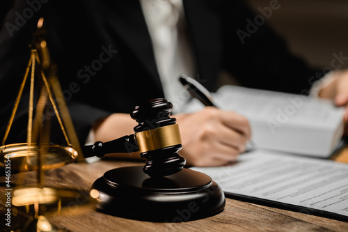 Law firm office, Selective focus judges gavel, businesswoman or female lawyer making contract paper with law book,.scales of justice, document legal, justice advice service concept.