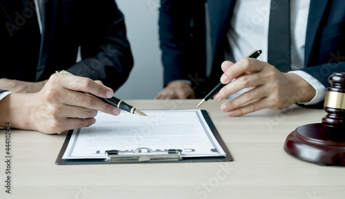 Lawyer hand holding pen and providing legal consult business dispute to the man