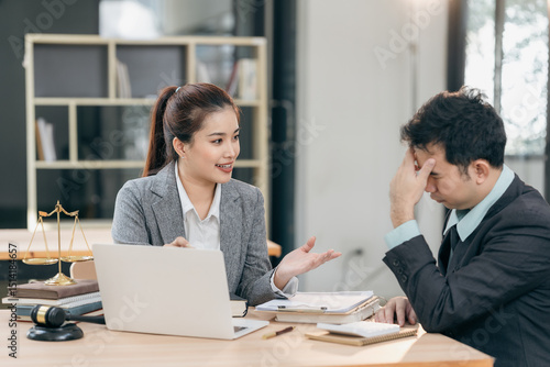 Lawyers discuss contract documents at a wooden table. Symbols of justice are hammer and scales, giving legal advice in a courtroom to clients.