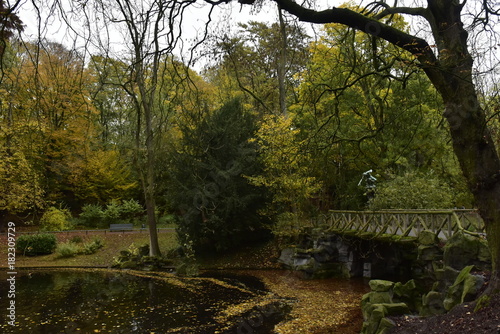 Le pont rustique sous la verdure luxuriante en automne ,au parc Josaphat à Schaerbeek